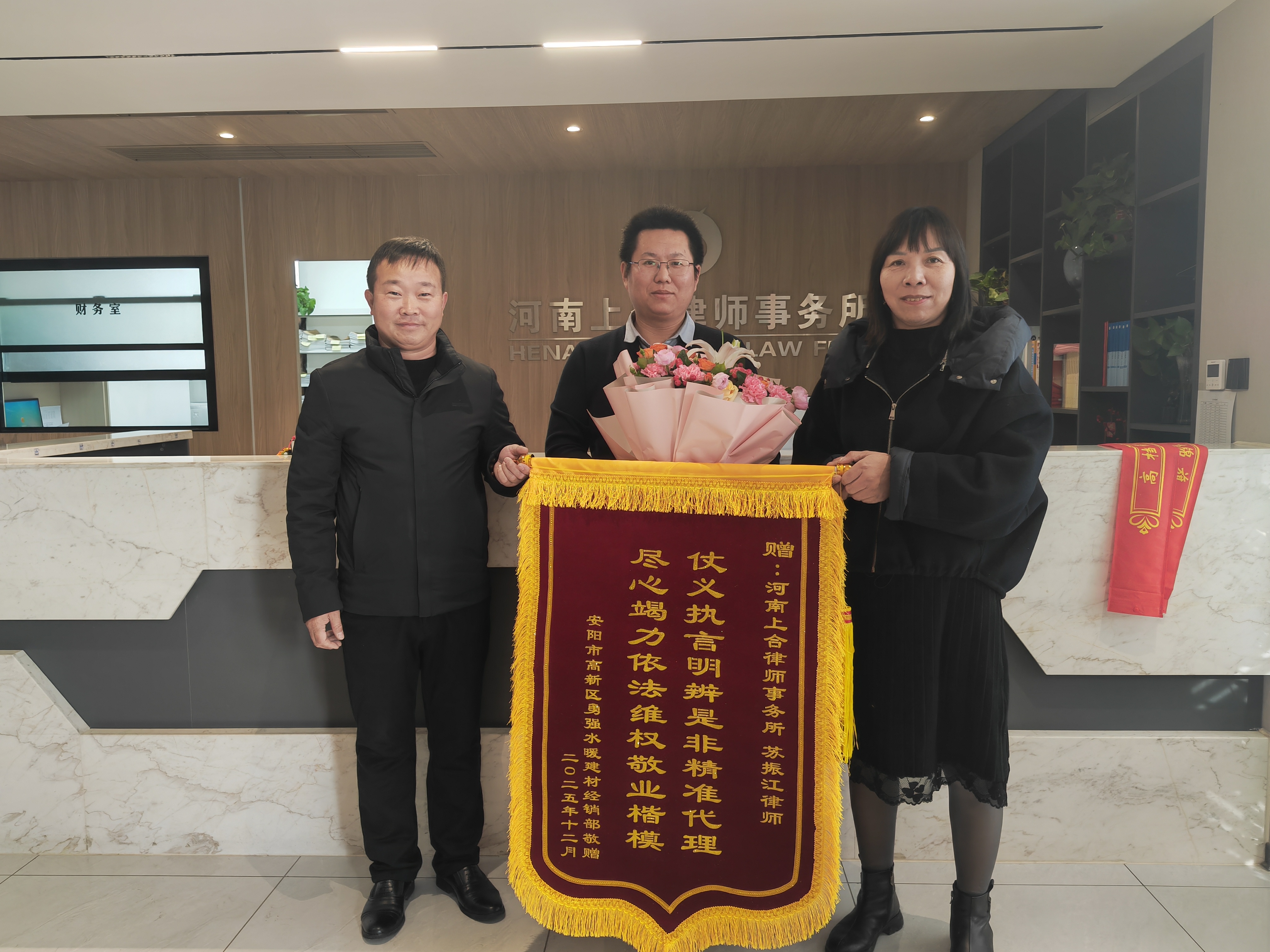 2025年12月8日,当事人专程来到律所,向该所两位律师分别赠送锦旗与鲜花,以表诚挚谢意。律所主任刘用田亲自接过锦旗,双方亲切交流,场面温馨。